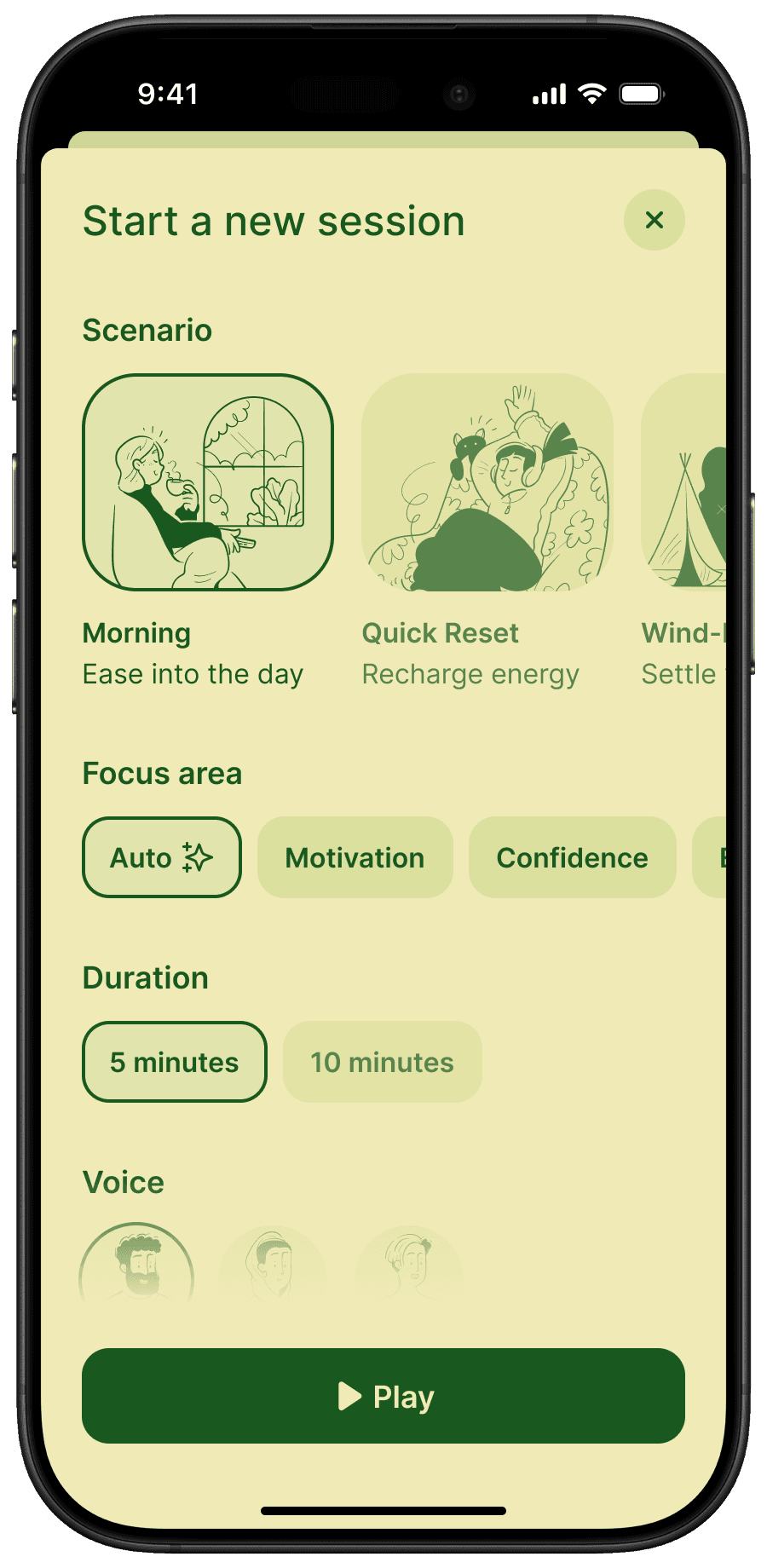 Most meditation apps make you search through endless content to find the right exercise. Elevate does the opposite. We generate a tailored session to what you need right now.
